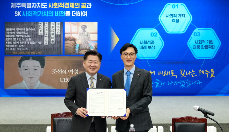 ¿À¿µÈÆ Áö»ç´Â ¡°Á¦ÁÖ´Â Àü±¹°ú ºñ±³ÇÏ¸é ±Ô¸ð°¡ ÀÛ¾Æ º¸ÀÌÁö¸¸ »çȸÀû°æÁ¦ÀÇ ¼ºÀå¼¼°¡ °¡ÆÄ¸£´Ù¡±¸ç ¡°¼ö´À½À¸·Î À̾îÁ®¿Â °øµ¿Ã¼Á¤½Å°ú °øµ¿ ¸¶À»ÀÚ»êÀÌ ¸¹Àº Á¦ÁÖÀÇ Æ¯¼º µî »çȸÀû°æÁ¦¸¦ Ű¿ì±â¿¡ ÁÁÀº ¿©°ÇÀ» °¡Áö°í ÀÖ´Ù¡±°í ¼³¸íÇß´Ù. ÀÌ¾î ¡°À̹ø Çù¾àÀ¸·Î SK±×·ìÀÌ Ãß±¸ÇÏ´Â ESG °æ¿µÀ» °ÈÇÏ°í ¾î·Á¿ò¿¡ óÇÑ Á¦ÁÖÀÇ »çȸÀû°æÁ¦ ±â¾÷µéÀÌ µµ¾àÇÏ´Â °è±â°¡ µÇ±â¸¦ ¹Ù¶õ´Ù¡±¸ç ¡°´Ù¾çÇÑ ºÐ¾ß¿¡ °ÉÃÄ Çù·Â ¸ðµ¨À» ¹ß±¼Çϰí Á¦ÁÖÀÇ °æÁ¦ÀûÀÎ °¡Ä¡¸¦ Ű¿ì´Â µ¥ ÇÔ²² ³ë·ÂÇØ ³ª°¥ °Í¡±À̶ó°í µ¡ºÙ¿´´Ù.