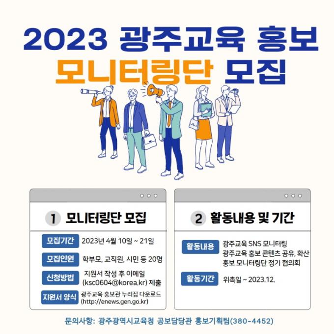 11ÀÏ ±¤Áֽñ³À°Ã»¿¡ µû¸£¸é ¡®±¤ÁÖ±³À° È«º¸ ¸ð´ÏÅ͸µ´Ü(ÀÌÇÏ ¸ð´ÏÅ͸µ´Ü)¡¯Àº ÃÑ 20¸íÀ¸·Î ±¸¼ºµÆÀ¸¸ç À§ÃË ÈÄ ¿ÃÇØ ¸»±îÁö Ȱµ¿ÇÏ°Ô µÈ´Ù. ƯÈ÷, ±¤Áֽñ³À°Ã»ÀÇ SNS ä³Î, È«º¸ ÄÜÅÙÃ÷ µîÀ» Çкθ𡤽ùÎÀÇ ´«À¸·Î ¸ð´ÏÅ͸µÇϰí ÇöÀåÀÇ ¹ÝÀÀ°ú ÀǰßÀ» ¼ö½Ã·Î Àü´ÞÇÑ´Ù. ¶Ç Á¤±â ÇùÀÇȸ¸¦ ÅëÇØ ´Ù¾çÇÑ °³¼± ÀǰßÀ» °øÀ¯ÇÒ °èȹÀÌ´Ù.