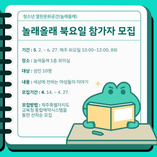 ¸ðÁý´ë»óÀº ¼ºÀÎ 10¸íÀ̸ç, ±â°£Àº 5¿ù 2ÀÏ(È)ºÎÅÍ 6¿ù 27ÀÏ(È)±îÁö(8ȸ) ¸ÅÁÖ È¿äÀÏ ¿ÀÀü 10½ÃºÎÅÍ 12½Ã±îÁöÀ̰í, û¼Ò³â ¿¸°¹®È°ø°£(³î·¡¿Ã·¡) 1Ãþ ȸÀǽǿ¡¼ ¿î¿µÇÑ´Ù. Âü°¡½ÅûÀº ¿À´Â 4¿ù 14ÀÏ(±Ý) 10½ÃºÎÅÍ Á¦ÁÖÆ¯º°ÀÚÄ¡µµ±³À°Ã» °ø°øµµ¼°ü ȨÆäÀÌÁö¸¦ ÅëÇÏ¿© ÇÒ ¼ö ÀÖ´Ù. ±×¹Û¿¡ ÀÚ¼¼ÇÑ »çÇ×Àº û¼Ò³â ¿¸°¹®È°ø°£[³î·¡¿Ã·¡](¢Ï759-8751)À¸·Î ÀüÈ ¹®ÀÇÇϰųª µµ¼°ü ȨÆäÀÌÁö °øÁö»çÇ×À» ÂüÁ¶ÇÏ¸é µÈ´Ù.