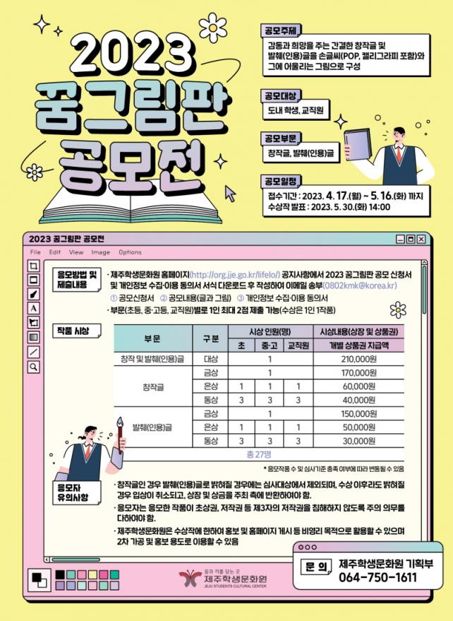 °ø¸ð±â°£Àº 4¿ù 17ÀÏ(¿ù)ºÎÅÍ 5¿ù 16ÀÏ(È)±îÁöÀÌ¸ç ´Ù¼öÀÇ Âü¿©¸¦ À¯µµÇϱâ À§ÇÏ¿© âÀÛ±Û ¿Ü¿¡ ¹ßÃé(Àοë)±Ûµµ °ø¸ðÇϸç 1ÀÎ 2ÀÛǰ Á¦Ãâ·Î ÇÑÁ¤Çϰí ÀÖ´Ù. ³»¿ëÀº °¨µ¿°ú Èñ¸ÁÀ» ÁÖ´Â °£°áÇÑ Ã¢ÀÛ±Û ¹× ¹ßÃé(Àοë)±ÛÀ» ¼Õ±Û¾¾(POP, ͏®±×¶óÇÇ Æ÷ÇÔ)¿Í ±×¿¡ ¾î¿ï¸®´Â ±×¸²À¸·Î ±¸¼ºÇÏ¸é µÈ´Ù.