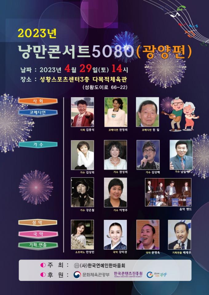 (»ç)Çѱ¹¿¬¿¹ÀÎÇѸ¶À½È¸¿¡¼ ÁÖÃÖÇÏ´Â ¡®2023³â ³¶¸¸ÄܼƮ 5080¡¯Àº Äڹ̵ð¾ð ±èÁ¾¼®ÀÇ »çȸ·Î ÁøÇàµÇ¸ç, ½ÄÀü Çà»ç·Î Áö¿ª °¡¼öµéÀÇ Èï°Ü¿î Æ®·ÎÆ® ¹«´ë°¡ ÁغñµÇ¾î ÀÖ´Ù.