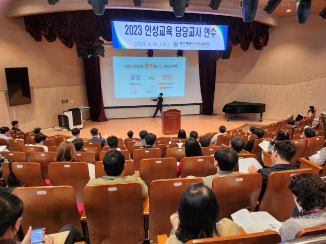 4¿ù 25ÀÏ(È) 13½Ã 30ºÐ, Á¦ÁÖÇлý¹®È¿ø ¼Ò°´ç¿¡¼ ÃÊ¡¤Áß¡¤°í Àμº±³À° ´ã´ç±³»ç 130¿©¸íÀÌ Âü¿©ÇÑ °¡¿îµ¥ Àμº±³À° ¿ª·® ÇÔ¾çÀ» À§ÇÑ ¿¬¼ö°¡ 3½Ã°£ µ¿¾È ÁøÇàÇß´Ù.