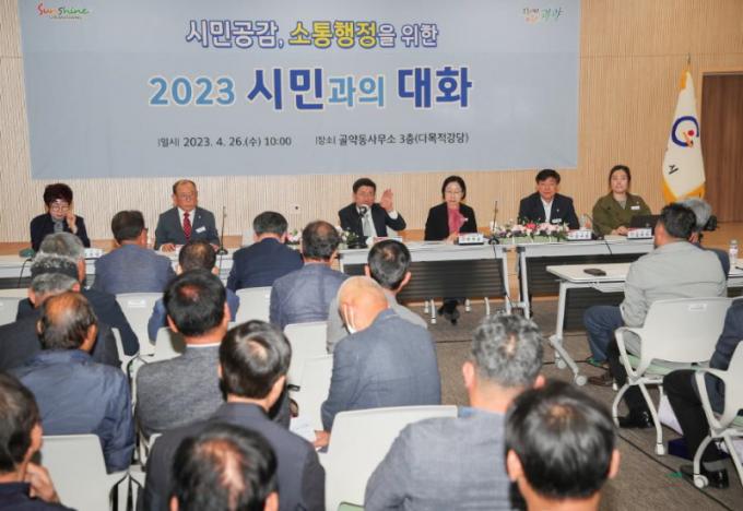 Á¤ÀÎÈ ½ÃÀå ÃëÀÓ ÀÌÈÄ µÎ ¹øÂ°·Î °³ÃÖµÈ À̹ø ¡®½Ã¹Î°úÀÇ ´ëÈ¡¯´Â ÁÖ¹Î, µµ¡¤½ÃÀÇ¿ø, »çȸ´ÜüÀå, Áö¿ª¿ø·Î, »çȸÀû ¹è·Á°èÃþ µî °¢°è°¢ÃþÀÌ Âü¼®ÇÑ °¡¿îµ¥ ¹Î¼±8±â ½ÃÁ¤¼º°ú ¹× ¿î¿µ ¹æÇâ º¸°í¿Í À¾¸éµ¿ Çö¾È »ç¾÷ ¼³¸í, ÁֹΠÀÇ°ß Ã»Ãë ¼øÀ¸·Î 120ºÐ °¡·® Áֹΰú Á÷Á¢ ¼ÒÅëÇÏ´Â ¹æ½ÄÀ¸·Î ÁøÇàµÆ´Ù.