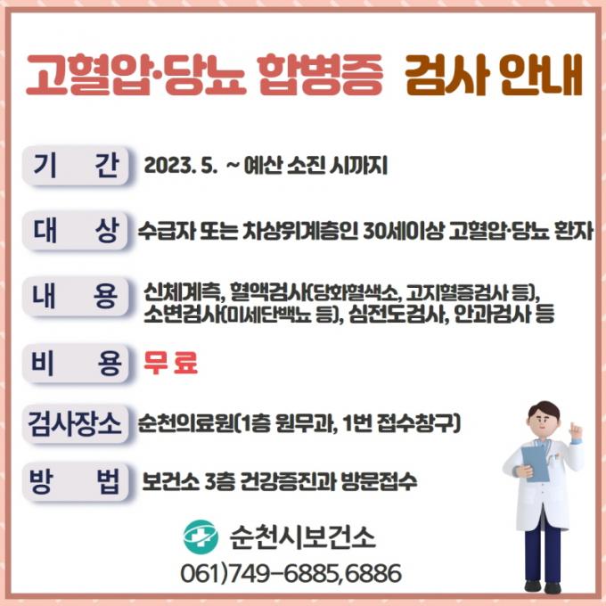¼øÃµ½Ã º¸°Ç¼Ò °ü°èÀÚ´Â ¡°°íÇ÷¾Ð, ´ç´¢º´Àº ³úÁ¹Áß, ½É±Ù°æ»ö, ½Ã·Â»ó½Ç µî ÇÕº´Áõ ¹ß»ýÀÌ ³ôÀº ÁúȯÀ¸·Î ÇÕº´Áõ ¿¹¹æÀÌ ¸Å¿ì Áß¿äÇϸç, À̹ø °Ë»ç¸¦ ÅëÇØ ÇÕº´Áõ ¹ß»ýÀ» ¿¹¹æÇÏ°í °Ç°À» ÁöŰ±æ ¹Ù¶õ´Ù¡±°í ¸»Çß´Ù.
