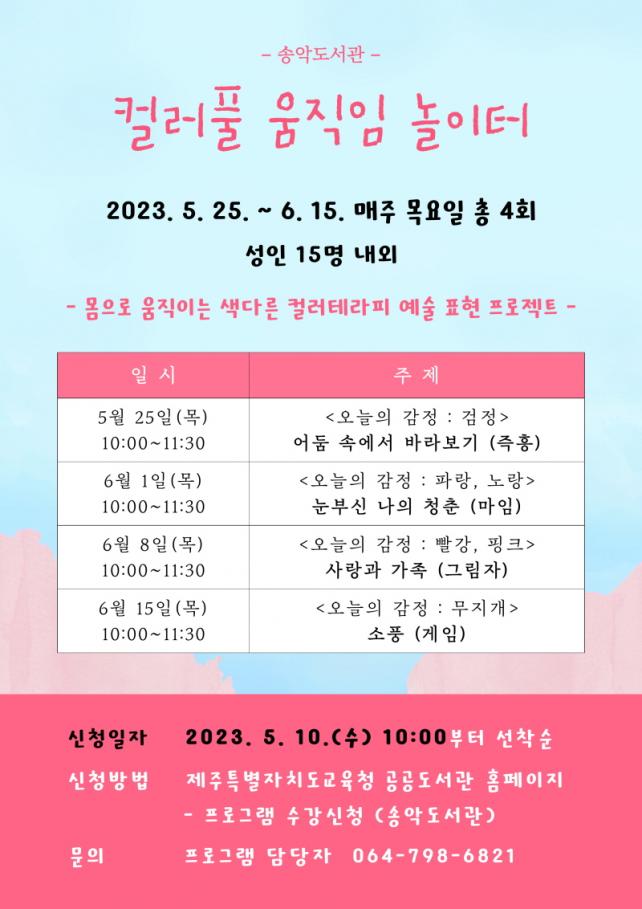 ¡®Ä÷¯Ç® ¿òÁ÷ÀÓ ³îÀÌÅÍ¡¯´Â »ö±ò°ú ¿òÁ÷ÀÓÀ» ¸Å°³·Î ³»¸éÀÇ ´Ù¾çÇÑ °¨Á¤À» Ç¥ÇöÇÏ¸ç ¿¬´ëÇϰí Ä¡À¯ÇÏ´Â »ö´Ù¸¥ °³³äÀÇ Ä÷¯Å×¶óÇÇ·Î °íÇý·Ã(Á¦ÁÖ±ØÀå»çȸÀûÇùµ¿Á¶ÇÕ) °»ç°¡ ÁøÇàÇÑ´Ù. º» ÇÁ·Î±×·¥Àº ¼ºÀÎ 15¸íÀ» ´ë»óÀ¸·Î 5¿ù 25ÀÏ(¸ñ)ºÎÅÍ 6¿ù 15ÀÏ(¸ñ)±îÁö ¸ÅÁÖ ¸ñ¿äÀÏ ÃÑ 4ȸ ¿î¿µµÇ¸ç, ½Ã°£Àº ¿ÀÀü 10½Ã¿¡¼ 11½Ã ¹Ý±îÁö·Î ¿¹Á¤µÇ¾îÀÖ´Ù.