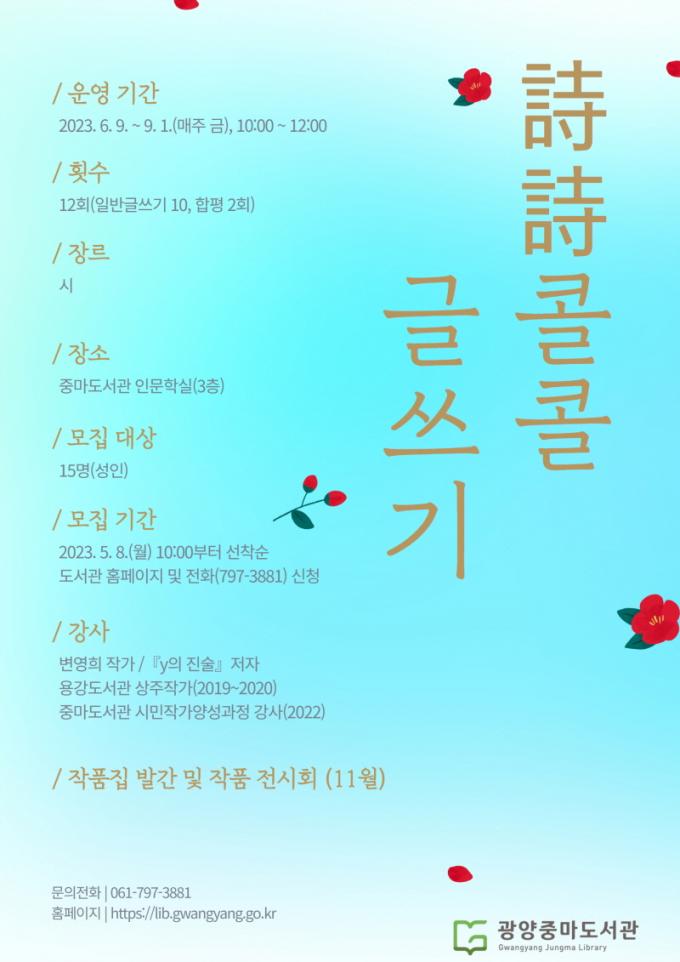 ¡®ãÌãÌÄÝÄÝ ±Û¾²±â¡¯ ÇÁ·Î±×·¥°ú °ü·ÃµÈ ¼¼ºÎ ³»¿ë°ú ÀÏÁ¤ µîÀº ±¤¾ç½Ã¸³µµ¼°ü ´©¸®Áý(lib.gwangyang.go.kr)°ú īī¿ÀÅå ä³Î, ÀνºÅ¸±×·¥ µîÀ» ÅëÇØ È®ÀÎ °¡´ÉÇϸç, ÀÚ¼¼ÇÑ ³»¿ëÀº ±¤¾çÁ߸¶µµ¼°ü(¢Ï061-797-3881)À¸·Î ¹®ÀÇÇÏ¸é ¾Ë ¼ö ÀÖ´Ù.
