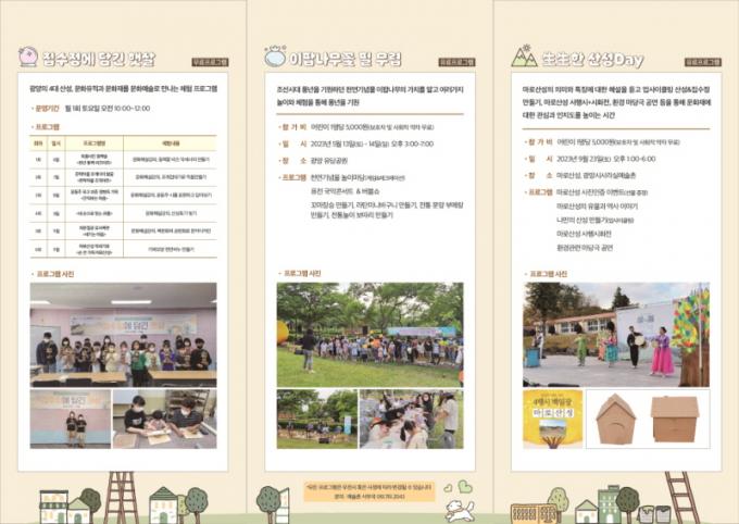 ÇÁ·Î±×·¥Àº ¿ì¸® Áö¿ªÀÇ ¹®ÈÀç¿Í °ü·ÃµÈ ¿¹¼úüÇè Ȱµ¿À» ÅëÇØ ¹®ÈÀ¯Àû¿¡ ´ã±ä ¶æ°ú ´ç½ÃÀÇ »ýȰ»óÀ» »ìÆìº¼ ¼ö ÀÖ´Â ¡ãÁý¼öÁ¤¿¡ ´ã±ä ÇÞ»ì, À¯´ç°ø¿ø¿¡¼ õ¿¬±â³ä¹°°ú ÇÔ²²ÇÏ´Â 500³â Àü Á¶¼±½Ã´ë dz³â ±â¿ø ÀÜÄ¡ ¡ãÀÌÆË³ª¹«²É ÇÊ ¹«·Æ, ±¤¾çÀÇ ¿©·¯ ¹®ÈÀç¿Í À¯ÀûÁö¸¦ Á÷Á¢ ޹æÇϴ üÇèÇà»ç ¡ã¹®ÈÀç ½ÃÆ¼Åõ¾î, ¸¶·Î»ê¼ºÀÇ °¡Ä¡¸¦ ¹è¿ì°í ¹®ÈÀ纸ȣ¿Í ȯ°æÀ» ¿¬°èÇÑ »ç¾÷ ¡ãßæßæÇÑ »ê¼ºDay µî ÃÑ 4°³ ÇÁ·Î±×·¥À¸·Î 11ȸ¿¡ °ÉÃÄ ¿î¿µµÈ´Ù.