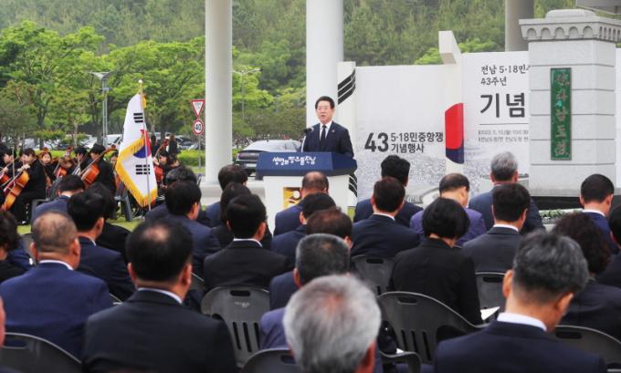 ¡®¿À¿ùÀÇ Á¤½ÅÀ» ¿À´ÃÀÇ Á¤ÀǷΡ¯¸¦ ÁÖÁ¦·Î ¿¸° À̳¯ ±â³ä½Ä¿£ ±è¿µ·Ï Àü³²µµÁö»ç¿Í ±¹È¸ÀÇ¿ø, µµÀÇ¿ø, 5¡¤18 À¯°øÀÚ¿Í À¯Á·, µµ À¯°ü±â°üÀå, »çȸ´Üü µî 300¿© ¸íÀÌ Âü¼®Çß´Ù.