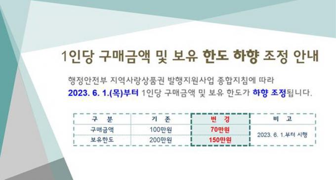 ½Ã´Â ÇàÁ¤¾ÈÀüºÎÀÇ ¡®Áö¿ª»ç¶û»óǰ±Ç ¹ßÇàÁö¿ø»ç¾÷ Á¾ÇÕÁöħ¡¯ º¯°æ¿¡ µû¶ó ³»´Þ 1ÀϺÎÅÍ ±¤¾ç»ç¶û»óǰ±Ç 1ÀÎ ±¸¸Å±Ý¾×À» ¿ù 100¸¸¿ø¿¡¼ 70¸¸¿øÀ¸·Î, º¸À¯ Çѵµ¸¦ 200¸¸¿ø¿¡¼ 150¸¸¿øÀ¸·Î ÇÏÇâ Á¶Á¤ÇÑ´Ù.