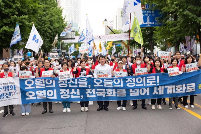 ÀÌÁ¤¼± ±³À°°¨À» ºñ·ÔÇÑ ½Ã±³À°Ã» Á÷¿øµéÀº ¼öâÃʵîÇб³¿¡¼ ÀüÀϺôµù±îÁö À̾îÁø ¡®¹ÎÁÖÆòÈ´ëÇàÁø¡¯¿¡ ÇÔ²²Çß´Ù. À̵éÀº ¡®¿À¿ùÀÇ Á¤½ÅÀ», ¿À´ÃÀÇ Á¤ÀÇ·Î! ¿À¿ùÀÇ Á¤½Å, Àü±¹È¸¦ ³Ñ¾î ¼¼°è·Î¡¯, ¡®´Ù½Ã ¹ÎÁÖÁÖÀÇ!¡¯ µî Ç÷¡Ä«µå¿Í ÇÇÄÏ µîÀ» µé°í, 5¡¤18 ¹ÎÁÖȿÀÇ ¿ÏÀüÇÑ Áø»ó±Ô¸í°ú Çå¹ýÀü¹® ¼ö·ÏÀ» Ã˱¸Çß´Ù.