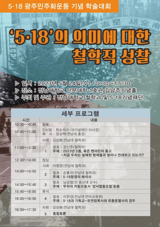 À̳¯ Çмú´ëȸ´Â Àι®´ëÇÐ 1È£°ü ±è³²ÁÖ±â³äȦ¿¡¼ <¡®5¡¤18¡¯ÀÇ Àǹ̿¡ ´ëÇÑ Ã¶ÇÐÀû ¼ºÂû>À» ÁÖÁ¦·Î ÁøÇàµÉ ¿¹Á¤ÀÌ´Ù. À̹ø Çмú´ëȸ´Â öÇÐÀÚ °½ÅÁÖÀÇ 「2023³â 5¿ù, ȤÀº º¥¾ß¹ÎÀÇ Ãæ°í-Áö±Ý ¿ì¸®´Â »ìÇØµÈ ÇüÁ¦µé°ú ¾ó¸¶³ª ¿¬´ëÇϰí Àִ°¡?」ÁÖÁ¦ÀÇ ±âÁ¶¹ßÇ¥·Î ½ÃÀ۵ȴÙ. À̾î 「5¡¤18Ç×ÀïÀÇ ÇØ¼®»ç」(¼ÕÈ«±¹ öÇйڻç), 「¹«À§ÀÇ ÀúÇ×À¸·Î¼ '¾ç¼Çùµ¿Á¶ÇÕ'¿îµ¿」(³²±ÃÇù Àü µ¿½Å´ë ±³¼ö), 「5.18°ú ±âµ¶±³-À¯¿¬Ã¢¸ñ»ç¿Í ·ùµ¿¿î¿»çÀÇ °æ¿ì」(ÀÌÇö°æ ¹®Çйڻç) ¹ßÇ¥°¡ ÁøÇàµÉ ¿¹Á¤ÀÌ´Ù.
