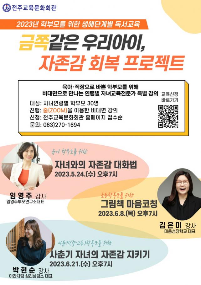 °ÀǸ¦ Èñ¸ÁÇÏ´Â Çкθ𳪠ÀüÁÖ ½Ã¹ÎÀº ´©±¸³ª ½ÅûÇÒ ¼ö ÀÖ°í °¢ °ÀÇ Àü ÀϱîÁö QRÄÚµå·Î Á¢¼ÓÇØ ÀüÁÖ±³À°¹®Èȸ°ü ´©¸®Áý(https://lib.jbe.go.kr/jec)¿¡¼ ¿øÇÏ´Â °ÀǸ¦ ½ÅûÇÒ ¼ö ÀÖ´Ù. °ÀÇ Âü¿© ¸µÅ© µîÀº °ÀÇ ´çÀÏ °³º°ÀûÀ¸·Î ¾È³»ÇÑ´Ù. °ÀÇ ÈÄ ¼º½ÇÇÏ°Ô Âü¿© ÇÑ Âü°¡ÀÚ¿¡°Ô´Â °¿¬ µµ¼¸¦ ¼±¹°·Î ÁõÁ¤ÇÒ ¿¹Á¤ÀÌ´Ù.
