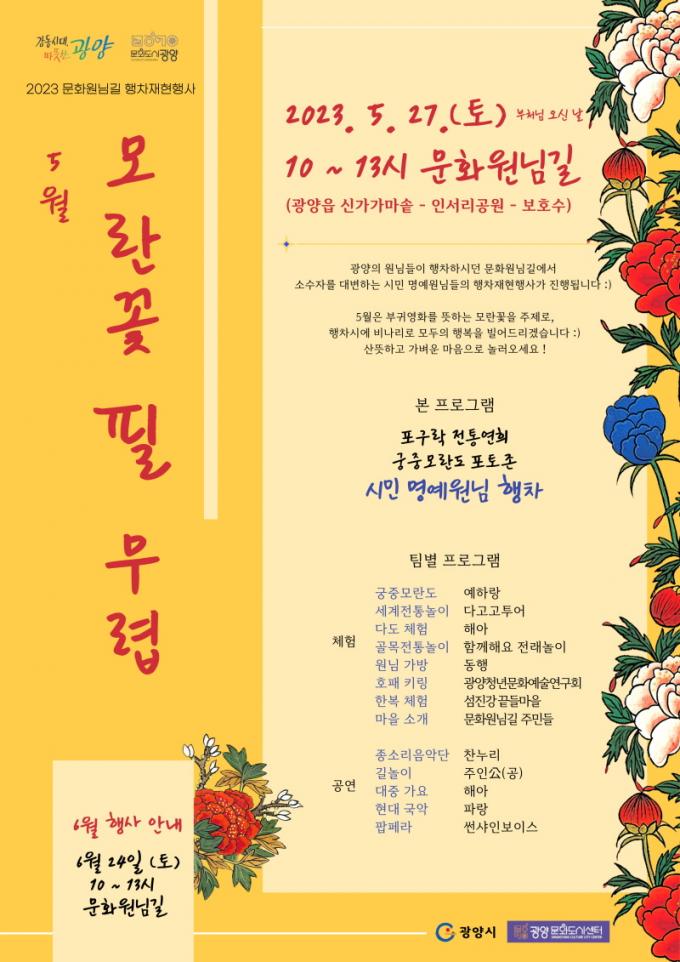 ¡®±¤¾ç ¹®È¿ø´Ô±æ ÇàÂ÷ ÀçÇö¡¯´Â Á¶¼±½Ã´ë ±¤¾çÀ¾¼ºÀÇ ¿ª»çÀû Àå¼Ò¸¦ ±â¹ÝÀ¸·Î ¸¶À»Áֹε鿡°Ô ±¸ÀüµÇ¾î ¿Â ¿ø´Ô ÇàÂ÷¸¦ ½Ã¹ÎµéÀÌ ¹®ÈÀû °üÁ¡¿¡¼ ´Ù¾çÇÑ ¾ÆÀ̵ð¾î¸¦ ¸ð¾Æ Á÷Á¢ ±âȹÇÏ°í ±¸ÇöÇÏ´Â Çà»çÀÌ´Ù.