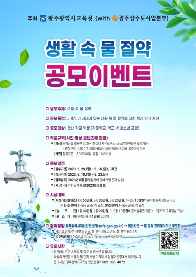 31ÀÏ ±¤Áֽñ³À°Ã»¿¡ µû¸£¸é À̹ø °ø¸ðÀüÀº ±¤ÁÖ»ó¼öµµ»ç¾÷º»ºÎ¿Í Çùµ¿À¸·Î ÁøÇàÇÑ´Ù. ÀÌ´Â ±âÈÄ À§±â ½Ã´ë¸¦ ¸ÂÀÌÇØ ¹°ÀÇ Á߿伺°ú ¼ÒÁßÇÔÀ» µÇ»õ°Ü º¸°í, ´õ ³ª¾Æ°¡ ÇлýµéÀÌ »ýȰ ¼Ó¿¡¼ ¹° Àý¾à Çʿ伺À» ÀνÄÇϰí Çൿ º¯È¸¦ ÀÚ¿¬½º·´°Ô À̲ø¾î³¾ ¼ö ÀÖµµ·Ï µ½±â À§Çؼ´Ù.