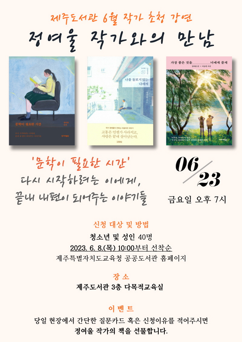 Á¤¿©¿ï ÀÛ°¡´Â¡®¹®ÇÐÀÌ ÇÊ¿äÇÑ ½Ã°£¡¯,¡®³ª¸¦ µ¹º¸Áö ¾Ê´Â ³ª¿¡°Ô¡¯, ¡®³¡±îÁö ¾²´Â ¿ë±â¡¯,¡®±×¶§ ¾Ë¾Ò´õ¶ó¸é ÁÁ¾ÒÀ» °Íµé¡¯µîÀÇ ÀúÀÚ·Î Àι®ÇÐ, ½É¸®ÇÐ, ±Û¾²±â¿¡ ´ëÇÑ °¿¬À¸·Î Àü±¹ÀÇ µ¶ÀÚµé°ú ¸¸³ª°í ÀÖ´Ù. À̹ø °¿¬Àº ¹®ÇÐÀÌ ÇÊ¿äÇÑ ½Ã°£À» ÁÖÁ¦·Î ³»ÆíÀÌ µÇ¾îÁÖ´Â ¼Ò¼³ ¼Ó À̾߱⸦ Âü°¡ÀÚµé°ú ÇÔ²² ³ª´ ¿¹Á¤ÀÌ´Ù.