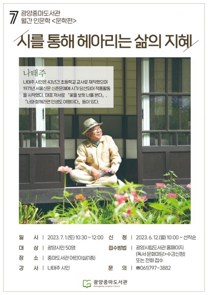 ¿ù°£ Àι®ÇÐ 3Â÷ °¿¬Àº ¿À´Â 12ÀÏ 10½ÃºÎÅÍ ±¤¾ç½Ã¸³µµ¼°ü ȨÆäÀÌÁö¿Í Àüȸ¦ ÅëÇØ ½Åû °¡´ÉÇϸç, ±¤¾ç½Ã¹Î 50¸íÀ» ¼±Âø¼ø ¸ðÁýÇÑ´Ù.