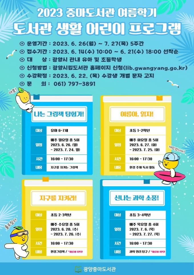 2023 ¿©¸§Çб⠵µ¼°ü »ýȰ ¾î¸°ÀÌ ÇÁ·Î±×·¥ ¼ö° ½Åû µî ±âŸ ±Ã±ÝÇÑ »çÇ×Àº ±¤¾ç½Ã¸³µµ¼°ü ´©¸®ÁýÀ» Âü°íÇϰųª Á߸¶µµ¼°ü(¢Ï061-797-3891)À¸·Î ¹®ÀÇÇϸé ÀÚ¼¼È÷ ¾Ë ¼ö ÀÖ´Ù.