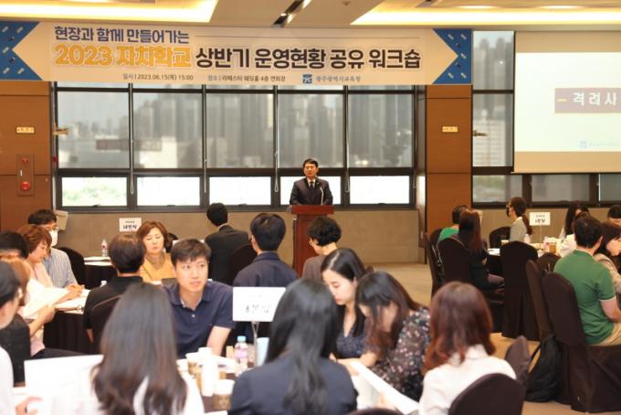ÀÌÁ¤¼± ±³À°°¨Àº °Ý·Á»ç¿¡¼ ¡°ÇлýµéÀÇ ´Ù¾çÇÑ ´Þ¶õÆ®°¡ ´Ù¾çÇÑ ½Ç·ÂÀ¸·Î Àß ¹ßÇöµÉ ¼ö ÀÖµµ·Ï ÀÚÀ²¼º¿¡ ±â¹ÝÇÑ Çб³ÀÇ ³ë·Â°ú º¯È°¡ ÇÊ¿äÇÏ´Ù¸ç, ÀÚÄ¡Çб³°¡ ±¤ÁÖ±³À° º¯ÈÀÇ ¸¶Áß¹° ¿ªÇÒÀ» ÇÒ ¼ö ÀÖµµ·Ï Àß ¿î¿µÇØ ´Þ¶ó¡±°í ´çºÎÇß´Ù. ÀÌ¾î ¡°±³À°Ã»¿¡¼µµ ¡®ÇöÀå°ú ÇÔ²² ¸¸µé¾î °¡´Â ÀÚÄ¡Çб³¡¯°¡ µÉ ¼ö ÀÖµµ·Ï ÇöÀå ¸ñ¼Ò¸®¿¡ ±Í ±â¿ïÀ̰í, ü°èÀûÀ¸·Î Áö¿øÇϰڴ١±°í µ¡ºÙ¿´´Ù.