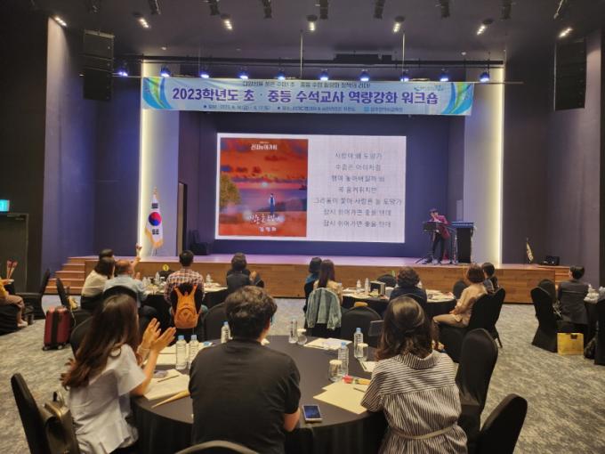 18ÀÏ ½Ã±³À°Ã»¿¡ µû¸£¸é ¡®ÃÊ‧Áßµî ¼ö¼®±³»ç ¿ª·®°È ¿öÅ©¼ó¡¯¿¡´Â ÃÊ‧Áßµî ¼ö¼®±³»ç¿Í ±³À°Àü¹®Á÷¿ø µî 50¿© ¸íÀÌ Âü¼®Çß´Ù. À̹ø ¿öÅ©¼óÀº ¼ö¼®±³»ç ¿ªÇÒ ¼öÇà °ü·Ã ¿ª·®°È ¿¬¼öÇÁ·Î±×·¥À» ÅëÇØ ¼ö¼®±³»çÀÇ Àü¹®¼ºÀ» ½ÅÀåÇϱâ À§Çؼ´Ù. ¶Ç ¼ö¼®±³»çÀÇ ¼ö¾÷ Ȱ¼ºÈ Á¤Ã¥ Áö¿ø ¹æ¾ÈÀ» ±³À°Àü¹®Á÷¿ø°ú ÇÔ²² ³íÀÇÇϱâ À§ÇÑ ÀåÀ¸·Î ¸¶·ÃÇß´Ù.