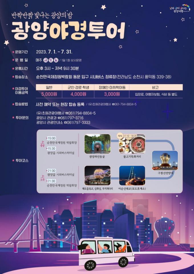 ±¤¾ç½Ã°¡ 7¿ù ÇÑ ´Þ°£ ÁÖ¸»(±Ý~ÀÏ¿äÀÏ) ¿ÀÈÄ 3½Ã, ¼øÃµ¸¸±¹°¡Á¤¿ø¿¡¼ ¿¹¾à ¾øÀÌ Å¾½ÂÇÒ ¼ö Àִ Ưº°ÇÑ ±¤¾ç¾ß°æ½ÃƼÅõ¾î¸¦ ¿î¿µÇÑ´Ù°í ¹àÇû´Ù.