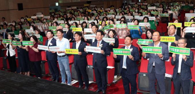 À̳¯ Çà»ç¿¡´Â ±è¿µ·Ï Àü³²µµÁö»ç, ±èÅÂ±Õ Àü³²µµÀÇȸ ºÎÀÇÀå, ³ë°ü±Ô ¼øÃµ½ÃÀå°ú Àü³² ¾î¸°ÀÌÁý ¿øÀå 500¿© ¸íÀÌ Âü¼®Çß´Ù. ½ÄÀü Çà»ç·Î Á¶¿ë³² Çѱ¹º¸À°ÁøÈï¿ø À°¾ÆÁ¾ÇÕÁö¿ø º»ºÎÀåÀÌ ¡®º¯ÈÇÏ´Â º¸À°È¯°æ°ú À¯º¸ÅëÇÕ¡¯À» ÁÖÁ¦·Î Ư°À» ÁøÇàÇØ Á¤ºÎ º¸À°Á¤Ã¥ ÀÌÇØ¸¦ ³ôÀÌ°í »ç¾÷ ÃßÁøÁ¤º¸¸¦ °øÀ¯Çß´Ù. ÀÌ¾î ¡®Çູ°¡µæ, ¿ôÀ½°¡µæ, ¾ÆÀ̵é°ú ÇÔ²²ÇÏ´Â Àü³²º¸À°¡¯À» ±¸È£·Î ÇÑ °³È¸¼±¾ð¿¡ ÀÌ¾î º»Çà»ç¿¡¼± º¸À° ¹ßÀü¿¡ °ø·Î°¡ Å« ¾î¸°ÀÌÁý ¿øÀå 31¸í¿¡°Ô µµÁö»ç ǥâÀ» Àü´ÞÇÏ°í °Ý·ÁÇß´Ù. ¶Ç Àü³² ±¹¸³Àǰú´ëÇÐ À¯Ä¡ ¼º¸í ¹ßÇ¥¿Í ÆÛÆ÷¸Õ½º¸¦ ÅëÇØ ¾ÆÀ̵éÀÇ ÀÇ·á±âº»±Ç°ú ±³À°±Ç º¸ÀåÀ» Á¤ºÎ¿¡ °·Â ¿ä±¸Çß´Ù.
