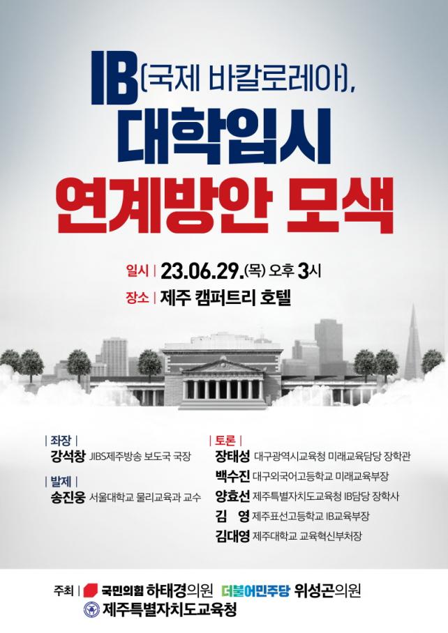 Á¦ÁÖ¿¡¼ °³ÃֵǴ À̹ø ¼¼¹Ì³ª´Â IBDP ÇлýÀÇ ´ëÀÔ ÇüÆò¼º È®º¸¸¦ À§ÇÑ ´ëÇÐÀԽà °³¼± ¹æ¾ÈÀ» ÇÔ²² °í¹ÎÇϱâ À§ÇØ ¸¶·ÃµÇ¾ú´Ù. ÀÌ´Â Áö³ 2¿ù 7ÀÏ ±¹È¸ ÀÇ¿øÈ¸°ü¿¡¼ ¿¸° ¼¼¹Ì³ª¿¡¼ Á¦ÁÖ․ºÎ»ê․´ë±¸․°æ±âµµ±³À°Ã» °ü°èÀÚ¿Í ±³À° Àü¹®°¡µéÀÌ Á¦±âÇÑ¡°IB ±³À°ÀÌ ±¹³»´ëÇÐ ÀÔ½ÃÀüÇü¿¡ ¹Ý¿µµÉ ¼ö ÀÖµµ·Ï Á¦µµ °³¼±¿¡ ´ëÇÑ ³íÀǰ¡ Çʿ䡱ÇÏ´Ù´Â Àǰ߿¡ ´ëÇÑ ÈÄ¼Ó Á¶Ä¡ÀÌ´Ù.