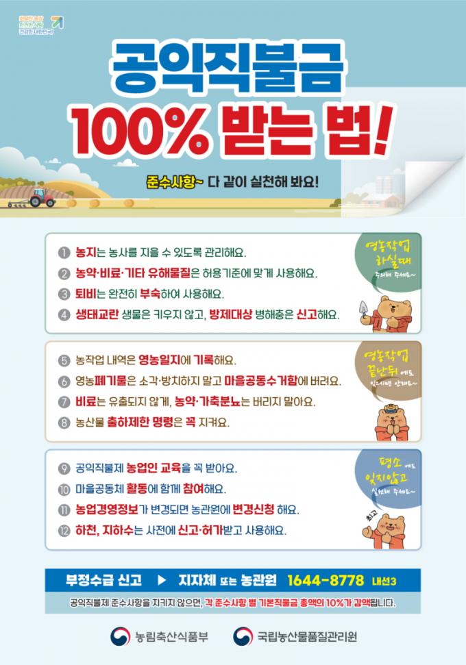 °øÀÍÁ÷ºÒ±Ý ½Åû ³óÁö¡¤³ó¾÷ÀÎÀ» ´ë»óÀ¸·Î ÀÚ°Ý¿ä°Ç °ËÁõ°ú Áؼö»çÇ× ÀÌÇà ¿©ºÎ¸¦ Á¡°ËÇÑ ÈÄ 10¿ù Áß Áö±Þ ´ë»óÀÚ ¹× Áö±Þ ±Ý¾×À» È®Á¤Çϰí 11¿ù²² ³ó¾÷Àο¡°Ô °øÀÍÁ÷ºÒ±ÝÀ» Áö±ÞÇÒ °èȹÀÌ´Ù.