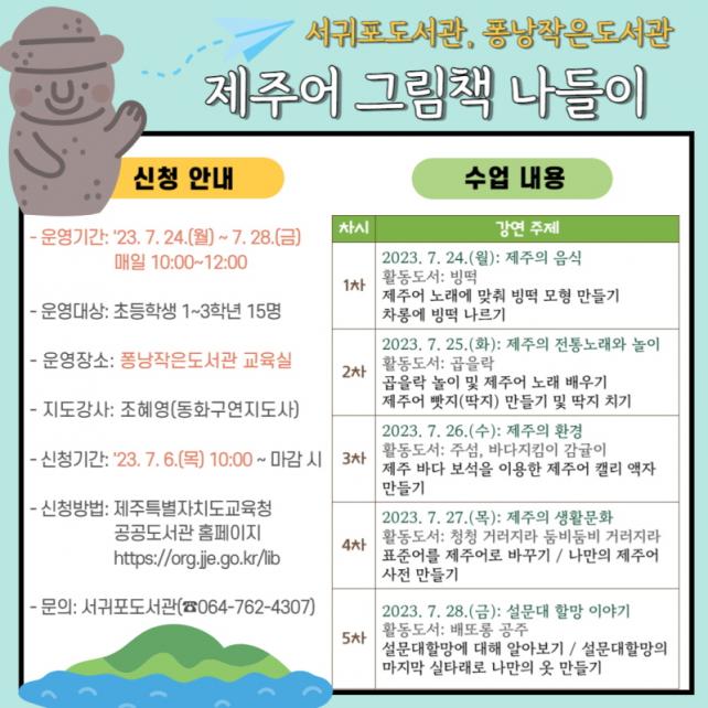 º» °Á´ ÃʵîÇлý 1~3Çгâ 15¸íÀ» ´ë»óÀ¸·Î 7¿ù 24ÀÏ(¿ù)ºÎÅÍ 7¿ù 28ÀÏ(±Ý)±îÁö ÃÑ 5ȸ¿¡ °ÉÃÄ, ¸ÅÀÏ ¿ÀÀü 10½ÃºÎÅÍ 12½Ã±îÁö Æþ³¶ÀÛÀºµµ¼°ü¿¡¼ ¿î¿µµÈ´Ù.