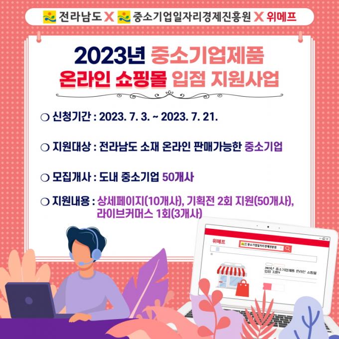 ¿Â¶óÀÎ ÆÇ¸Å °¡´ÉÇÑ Àü³²Áö¿ª Áß¼Ò±â¾÷ 50°³ »ç¸¦ ¼±Á¤ÇØ ¢ßÀ§¸ÞÇÁ ÀÔÁ¡À» Áö¿øÇÑ´Ù. ½Åû ±â°£Àº ¿À´Â 21ÀϱîÁö·Î Çʿ伷ù¸¦ ÁغñÇØ Àü³²Áß¼Ò±â¾÷ÀÏÀÚ¸®°æÁ¦ÁøÈï¿øÀ¸·Î ÀüÀÚ¿ìÆí(ksg8603@jepa.kr)À» ÀÌ¿ëÇØ Á¦ÃâÇÏ¸é µÈ´Ù.