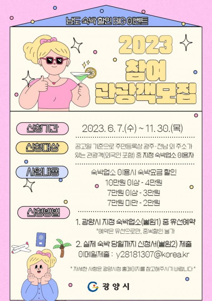 Âü°¡ ÀÚ°ÝÀº ±¤ÁÖ¡¤Àü³² ¿Ü ÁÖ¼Ò¸¦ µÐ °ü±¤°´À¸·Î À̺¥Æ® Âü¿© ¼÷¹Ú¾÷¼Ò Áß 1°³¼Ò¸¦ ¼±ÅÃÇØ À¯¼±À¸·Î ¿¹¾àÇÑ ÈÄ ½Åû¼¸¦ Á¦ÃâÇÏ¸é µÈ´Ù. ½Åû¼´Â ½Ã ȨÆäÀÌÁö¿¡¼ ³»·Á¹ÞÀ» ¼ö ÀÖÀ¸¸ç, Èñ¸ÁÇÏ´Â ÀÚ´Â Èñ¸Á ¼÷¹Ú ´çÀϱîÁö ´ã´çÀÚ À̸ÞÀÏ(y28181307@korea.kr)·Î ½Åû¼¸¦ Á¦ÃâÇÏ¸é µÈ´Ù.