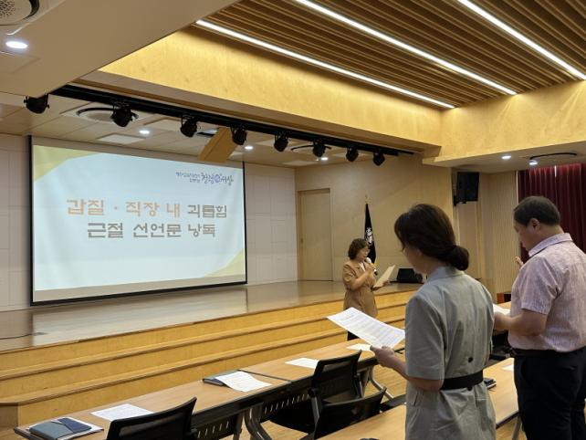 À̹ø Çà»ç´Â 2023³â Á¦Áֽñ³À°Áö¿øÃ» °©Áú․Á÷Àå³» ±«·ÓÈû ±ÙÀý ¼¼ºÎ°èȹÀÇ ÀÏȯÀ¸·Î¡®»óÈ£ Á¸ÁßÇÏ°í °ø°¨ÇÏ´Â ÇູÇÑ Á÷Àå¹®È ¸¸µé±â¡¯¸¦ À§ÇÑ Àü Á÷¿øÀÇ ´ÙÁüÀ» ´ã¾Ò´Ù. ±èÂùÈ£ ±³À°ÀåÀº¡°¹é ¹ø Áß 99¹øÀÌ Àß µÇ´õ¶óµµ ´Ü ÇÑ ¹øÀÇ ½Ç¼ö°¡ ŸÀο¡°Ô »óó¸¦ ÁÙ ¼ö ÀÖ´Ù¡±¸é¼ Á÷¿ø ¸ðµÎ°¡ Áö¼ÓÀûÀ¸·Î ¼ºÂûÇÏ´Â ÀÚ¼¼°¡ ÇÊ¿äÇÏ´Ù°í ¸»Çß´Ù.