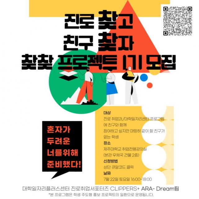 ãã ÇÁ·ÎÁ§Æ®´Â 21ÀϱîÁö Âü¿©ÇÒ ÇлýµéÀ» ¸ðÁý ÁßÀÌ´Ù. Á¦ÁÖ´ëÇб³ Áø·ÎÃë¾÷ ÇÁ·Î±×·¥¿¡ °°ÀÌ ÇÒ »ç¶÷ÀÌ ¾ø¾î¼ ¶Ç´Â È¥ÀÚ °¬´Ù°¡ ±¦È÷ ¸Ó¾³ÇÒ±îºÁ ½ÅûÀ» ÁÖÀúÇß´ø ÇлýÀ̶ó¸é ´©±¸³ª ½Åû°¡´ÉÇÏ´Ù. ÀÚ¼¼ÇÑ ³»¿ëÀº Á¦ÁÖ´ëÇб³ ȨÆäÀÌÁö °øÁö»çÇ×À» ÅëÇØ È®ÀÎÇÒ ¼ö ÀÖ´Ù.