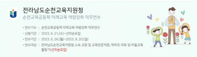 À̹ø ¿¬¼ö´Â Çб³ÀÚÄ¡, ¹ÎÁֽùα³À°, »ýÅÂÀüȯ±³À°, VR Ȱ¿ë ¼ö¾÷, ºÎ¸ð±³À°, ÀΰøÁö´É 꺿 ¼ö¾÷, µðÁöÅÐ ¸®ÅÍ·¯½Ã µî 18°³ÀÇ ´Ù¾çÇÑ °úÁ¤ÀÌ °³¼³µÇ¾úÀ¸¸ç, ¼øÃµ±³À°°øµ¿Ã¼ÀÇ ¹Ì·¡ ±³À°¿¡ ´ëÇÑ ÀÌÇØ¸¦ µ½°í Àü¹®¼º °È¸¦ Áö¿øÇÒ »Ó ¾Æ´Ï¶ó Áö¿ª°ú »ó»ýÇÏ´Â ¼øÃµÇü ±³À°ÀÚÄ¡¸¦ ½ÇÇöÇϰíÀÚ ±âȹµÇ¾ú´Ù.