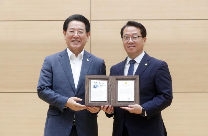 ÀÌÀӽĿ¡¼´Â ÀçÀÓ ±â°£ Ȱµ¿À» ´ãÀº ±â³ä ¿µ»óÀ» »ó¿µÇÏ°í ±è¿µ·Ï µµÁö»ç°¡ °ø·ÎÆÐ¸¦, Á¤¹«ºÎÁö»ç°¡ ÀçÁ÷±â³äÆÐ¸¦ Àü´ÞÇÑ ÈÄ Á÷¿øµéÀÌ Ãß¾ïÀÌ ´ã±ä »çÁøÃ¸°ú ²É´Ù¹ßÀ» Àü´ÞÇß´Ù.