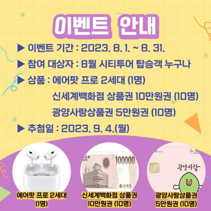 À̺¥Æ®¿¡ Âü¿©ÇÏ·Á¸é ±¤¾ç½ÃƼÅõ¾î ÀÌ¿ë Èı⸦ º»ÀÎ SNS¿¡ ¾÷·ÎµåÇÑ ÈÄ ÇØ´ç °Ô½Ã±ÛÀ» ĸó, ±¤¾ç½Ã ¹®È°ü±¤È¨ÆäÀÌÁö ½ÃƼÅõ¾î ¡®À̺¥Æ®ÀÀ¸ð¡¯ ÆäÀÌÁö¿¡ ½ÅûÇÏ¸é µÈ´Ù. ÀÀ¸ð ±â°£Àº ÀÌ´Þ 31ÀϱîÁöÀÌ¸ç ³»´Þ ÃÊ Ãß÷À» ÅëÇØ ¿¡¾îÆÌ ÇÁ·Î, ¹éÈÁ¡ ¹× ±¤¾ç»ç¶û»óǰ±Ç µîÀÇ ¼±¹°À» ÁõÁ¤ÇÒ °èȹÀÌ´Ù.