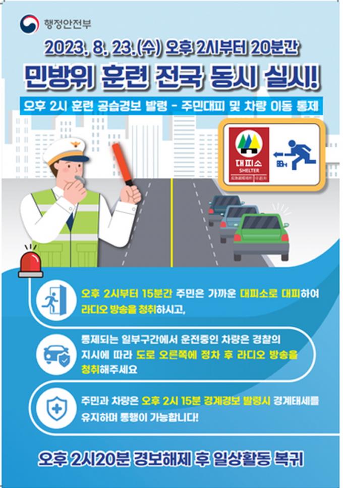 ÈÆ·ÃÀº °ø½À°æº¸ ¹ß·É, °æ°è°æº¸ ¹ß·É, °æº¸ ÇØÁ¦ ¼øÀ¸·Î ÁøÇàµÈ´Ù. ¿ÀÈÄ 2½Ã Àü±¹¿¡¼ ÈÆ·Ã °ø½À°æº¸ »çÀÌ·»ÀÌ ¿ï¸®¸é 15ºÐ°£ À̵¿ÀÌ ÅëÁ¦µÈ´Ù. ±¹¹ÎµéÀº °¡±î¿î ÁöÇÏ´ëÇÇ¼Ò µî ¾ÈÀüÇÑ Àå¼Ò·Î ´ëÇÇÇØ¾ß ÇÑ´Ù.