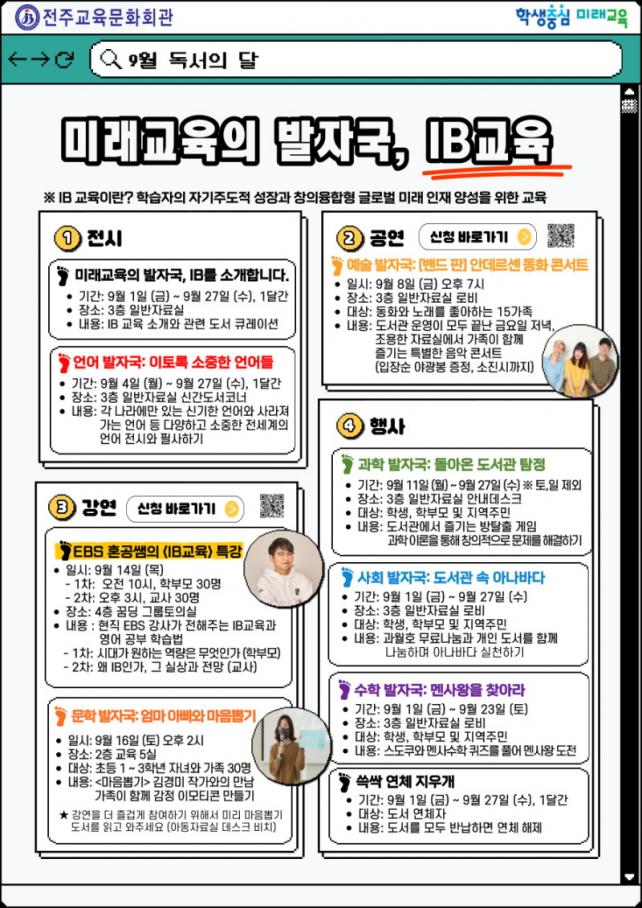 9¿ù µ¶¼ÀÇ ´Þ °ü·Ã ÀÚ¼¼ÇÑ ÀÏÁ¤°ú ½Åû ¹æ¹ýÀº ÀüÁÖ±³À°¹®Èȸ°ü ´©¸®Áý(https://lib.jbe.go.kr/jec)¿¡¼ È®ÀÎÇÒ ¼ö ÀÖ´Ù.