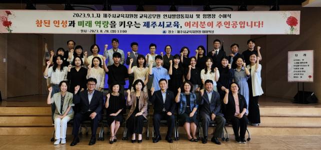 [½Ã»çÁ¾ÇսŹ® = °í¼º¹Î ±âÀÚ] Á¦Áֽñ³À°Áö¿øÃ»(±³À°Àå ±èÂùÈ£)Àº Áö³ 28ÀÏ(¿ù) Á¦Áֽñ³À°Áö¿øÃ» ´ëȸÀǽǿ¡¼ 2023.9.1.ÀÚ ±³°¨ ½ÂÁøÀÚ 9¸í, ±³À°Àü¹®Á÷¿ø 5¸í, ½Å±Ô±³»ç 13¸í¿¡ ´ëÇÑ Àλç¹ß·ÉÅëÁö¼ ¹× ÀÓ¸íÀå ¼ö¿©½ÄÀ» °³ÃÖÇß´Ù.