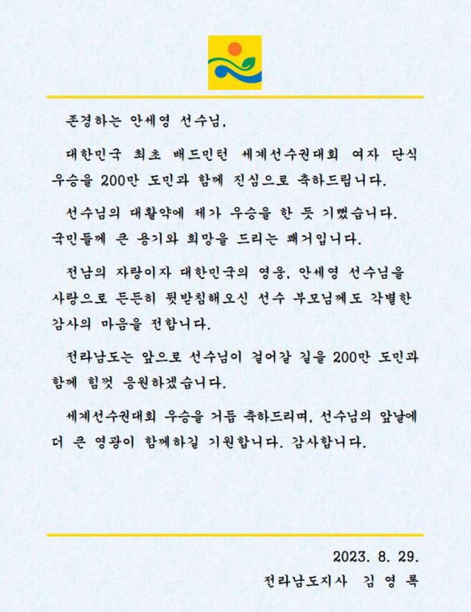 ±è¿µ·Ï Àü³²µµÁö»ç´Â 29ÀÏ ¾È¼¼¿µ ¼±¼ö¿¡°Ô Àü³²µµ¹ÎÀÇ ¸¶À½À» ´ã¾Æ ÃàÀüÀ» º¸³Â´Ù.