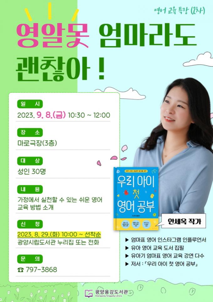 À̹ø °¿¬Àº ¿À´Â 8ÀÏ(±Ý) ¿ÀÀü 10½Ã 30ºÐ¿¡ <¿ì¸® ¾ÆÀÌ Ã¹ ¿µ¾î °øºÎ> ÀúÀÚÀÌÀÚ ¾ö¸¶Ç¥ ¿µ¾î Àü¹®°¡ÀÎ ¾È¼¼¿Á ÀÛ°¡¸¦ ÃʺùÇØ °¡Á¤¿¡¼ ½ÇõÇÒ ¼ö ÀÖ´Â ½¬¿î ¿µ¾î ±³À°¹ýÀ» ¼Ò°³ÇÑ´Ù.