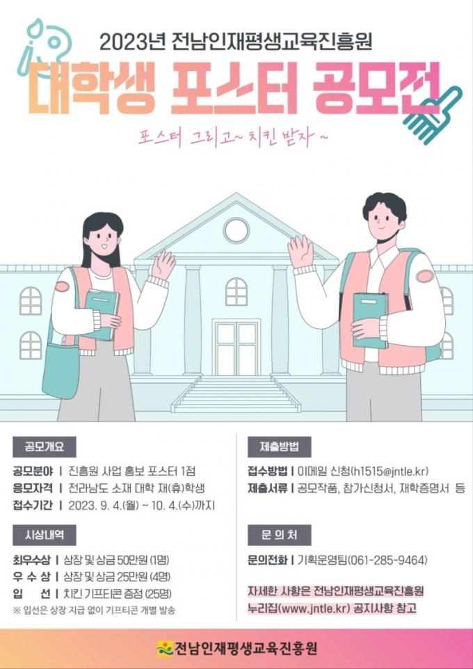 °ø¸ð ÁÖÁ¦´Â ¡®Àü³²ÀÎÀçÆò»ý±³À°ÁøÈï¿ø »ç¾÷À» È¿°úÀûÀ¸·Î È«º¸ÇÒ Æ÷½ºÅÍ¡¯·Î Àü³² ¼ÒÀç ´ëÇÐ ÀçÇлýÀÌ¸é ´©±¸³ª Âü¿©ÇÒ ¼ö ÀÖ´Ù. Á¢¼ö ±â°£Àº 10¿ù 4ÀϱîÁö´Ù.