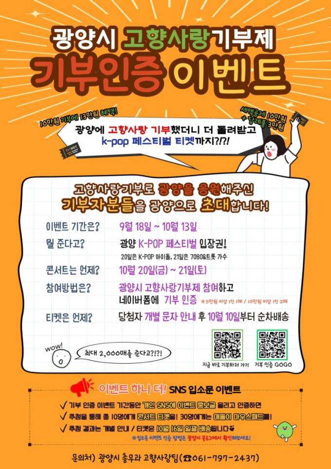 À̹ø ±âºÎÀÎÁõ À̺¥Æ®´Â ±¤¾ç °íÇâ»ç¶û±âºÎÁ¦ Âü¿© ½Ã ¼¼¾×°øÁ¦¿Í ´ä·Êǰ Á¦°ø ÇýÅà ¿Ü¿¡ Á¦3ȸ ±¤¾ç K-POP Æä½ºÆ¼¹ú °ø¿¬ ÀÔÀå±ÇÀ» Ãß°¡·Î ÁõÁ¤ÇÏ´Â À̺¥Æ®·Î, 2023³â 1¿ù 1ÀϺÎÅÍ ±¤¾ç½Ã¿¡ 5¸¸¿ø ÀÌ»ó ±âºÎÇÑ ±âºÎÀÚµéÀ» ´ë»óÀ¸·Î ½Ç½ÃµÈ´Ù.