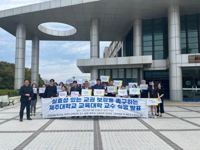 ¼º¸í ¹ßÇ¥´Â ±³±Ç º¸ÀåÀ» Ã˱¸ÇÏ´Â Á¦ÁÖ´ë ±³À°´ëÇÐ ±³¼ö Àϵ¿°ú ±³À°´ëÇÐ Çлýȸ°¡ °øµ¿ ÁÖ°üÇÑ ¡®±³±Ç º¸Àå ¹× °ø±³À° Á¤»óȸ¦ À§ÇÑ Á¦ÁÖ´ë ±³À°´ëÇÐ °øµ¿Çൿ¡¯ Çà»çÀÇ ÀÏȯÀ¸·Î ÀÌ·ïÁ³´Ù.