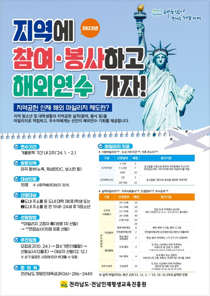 Àü³²µµ´Â 10¿ù Çϼø²² ¸ðÁý °ø°í¸¦ °ÅÃÄ 12¿ù ´ë»óÀÚ¸¦ ¼±¹ßÇϰí, 2024³â 1~2¿ù²² 2ÁÖ ÀÏÁ¤À¸·Î ÇØ¿Ü¿¬¼ö(¹Ì±¹ ¿¹Á¤)¸¦ ÃßÁøÇÒ °èȹÀÌ´Ù. ±âŸ ÀÚ¼¼ÇÑ »çÇ×Àº Àü³²µµ Èñ¸ÁÀÎÀçÀ°¼º°ú ±³À°Áö¿øÆÀ(061-286-3441)À¸·Î ¹®ÀÇÇÏ¸é µÈ´Ù.