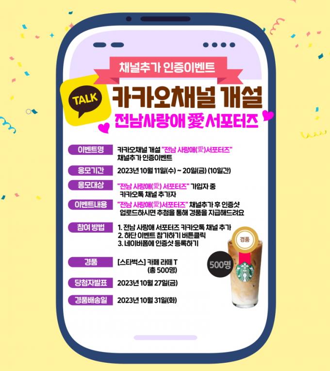 À̹ø À̺¥Æ®´Â īī¿Àä³Î ¡®Àü³² »ç¶û¾Ö ¼Æ÷ÅÍÁ ¹× Àü³² »ç¶û¾Ö(äñ) ¼Æ÷ÅÍÁî ´©¸®Áý(https://namdo2.jeonnam.go.kr/jnsupports/)À» ÅëÇØ ÀÚ¼¼ÇÑ ³»¿ëÀ» È®ÀÎÇÒ ¼ö ÀÖ´Ù.