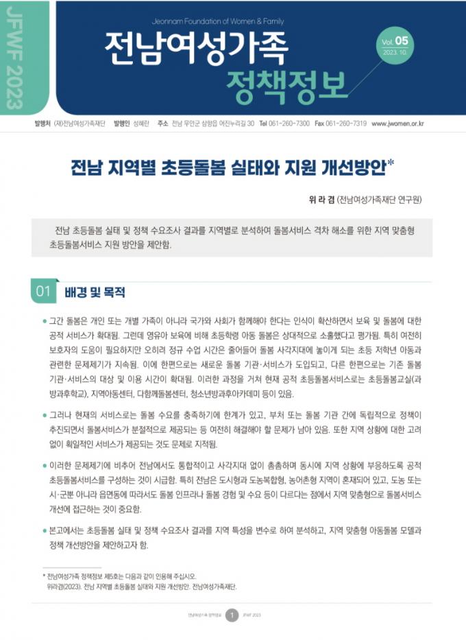 Àü³²¿©¼º°¡Á·Àç´Ü ¼ºÇý¶õ ¿øÀåÀº ¡°Àü³² ¾îµð¿¡ »ìµç ¾Æµ¿µéÀÌ Áú ÁÁÀº µ¹º½¼ºñ½º¸¦ ¹ÞÀ» ¼ö ÀÖµµ·Ï ÇÏ´Â °ÍÀº Àα¸ ¼Ò¸ê À§±â¿¡ ³õÀÎ Àü³²ÀÇ ¹Ì·¡¸¦ À§Çؼµµ Áß¿äÇÏ´Ù¡±°í °Á¶Çϸç, ¡°À̹ø¿¡ ¹ß°£ÇÑ Á¤Ã¥Á¤º¸°¡ Çб³¿Í ¸¶À»ÀÌ ÇÔ²²ÇÏ´Â ÃÎÃÎÇÑ Ãʵº½¸ÁÀ» Á¶¼ºÇϰíÀÚ ÇÏ´Â ºÐµé¿¡°Ô À¯¿ëÇÑ ÂüÁ¶°¡ µÇ±â¸¦ ¹Ù¶õ´Ù ¡±°í ¹àÇû´Ù.