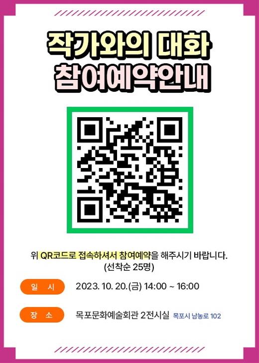 ÀÛ°¡¿ÍÀÇ ´ëÈ »çÀü ¿¹¾àÀº Àü³²±¹Á¦¼ö¹¬ºñ¿£³¯·¹ °ø½Ä ´©¸®Áý(http://www.sumukbiennale.kr/) ÆË¾÷â Á¤º¸¹«´Ì(QRÄÚµå)·Î Á¢¼ÓÇØ ½ÅûÇÏ¸é µÈ´Ù. ¹Ú±Ù½Ä Àü³²±¹Á¦¼ö¹¬ºñ¿£³¯·¹ »ç¹«±¹ÀåÀº ¡°ÀÛ°¡¿ÍÀÇ ´ëȸ¦ ÅëÇØ ÀÛ°¡¿Í °ü¶÷°´ÀÌ ¼ÒÅëÇϰí ÀÛǰÀ» ÀÌÇØÇÏ´Â ¼ÒÁßÇÑ ½Ã°£ÀÌ µÇ±æ ¹Ù¶õ´Ù¡±¸ç ¡°¼ö¹¬ ÀÛǰ¿¡ ´ëÇÑ °¨»ó ´É·ÂÀ» ³ôÀÌ°í ½Ã¾ß¸¦ È®ÀåÇÏ´Â ÁÁÀº ±âȸ°¡ µÉ °Í¡±À̶ó°í ¸»Çß´Ù.
