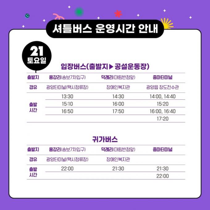±¤¾çÀ¾±Ç ¼ÅƲ¹ö½º´Â ¿ë°¸®(¼Ûº¸7Â÷ ÀÔ±¸)~±¤¾çÅ͹̳Î~±¤¾ç°ø¼³¿îµ¿Àå°ú ´ö·Ê¸®(´ë¸²¹ÝÁ¡ ¾Õ)~±¤¾ç°ø¼³¿îµ¿Àå µî 2°³ ³ë¼±À¸·Î ¿î¿µµÇ¸ç 13½Ã 30ºÐ ù ¿îÇàÀ» ½ÃÀÛÀ¸·Î 17½Ã 30ºÐ±îÁö ¸Å½Ã 30ºÐ °¢°¢ ÃÑ 5ȸ ¿îÇàµÈ´Ù.