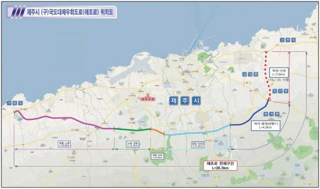 ÇÑÆí, Á¦ÁÖµµ´Â Á¦Áֽà µµ½ÉÁö¿ª ±³Åë·®À» ºÐ»êÇÏ°í ±³ÅëÈ¥ÀâÀ» °³¼±Çϱâ À§ÇØ ±¸±¹µµ ´ëü¿ìȸµµ·ÎÀÎ ¾ÖÁ¶·Î °³¼³°ø»ç¸¦ 1999³âºÎÅÍ ÃßÁøÇØ ¿Ô´Ù. Àüü 26.3§°¸¦ 6°³ ±¸°£À¸·Î ³ª´² 1±¸°£¿¡¼ 5±¸°£±îÁö 22.1§° µµ·Î °Ç¼³¿¡ »ç¾÷ºñ 2,988¾ï ¿øÀ» ÅõÀÔÇßÀ¸¸ç 2019³â 10¿ù °ø»ç¸¦ ¸¶¹«¸®Çß´Ù.