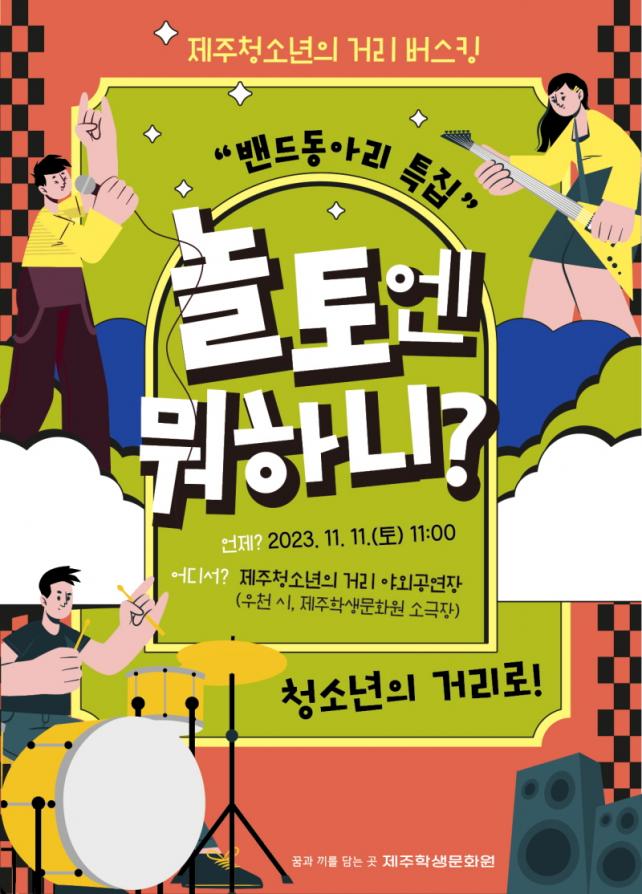 ¹êµåµ¿¾Æ¸® ƯÁýÀ¸·Î ¸¶·ÃµÇ´Â À̹ø¡®³îÅä¿£ ¹¹ÇÏ´Ï? û¼Ò³âÀÇ °Å¸®·Î!¡¯°ø¿¬Àº Á¦ÁÖÁß¾Ó¿©Áß ¸±¸®½º¹êµå, Á¦ÁÖµ¿¿©Áß ¾îµñ¼Ç, ´ëÁ¤Áß․NLCS․KIS¿¬ÇÕ ·±¾ØÁ¶ÀÌ µî ÁßÇб³ ¹êµåµ¿¾Æ¸® 3ÆÀ°ú Á¦ÁÖ¿©»ó inuce, ¾Ö¿ù°í A.D.A.M µî °íµîÇб³ ¹êµå 2ÆÀÀ» ºñ·ÔÇÏ¿© ¾Æ¶óû¼Ò³â¹®ÈÀÇÁý Àç±Ô¾î¹êµåÀÇ Âü¿©·Î ´Ùä·Ó°Ô ÀÌ·ç¾îÁú ¿¹Á¤ÀÌ´Ù.